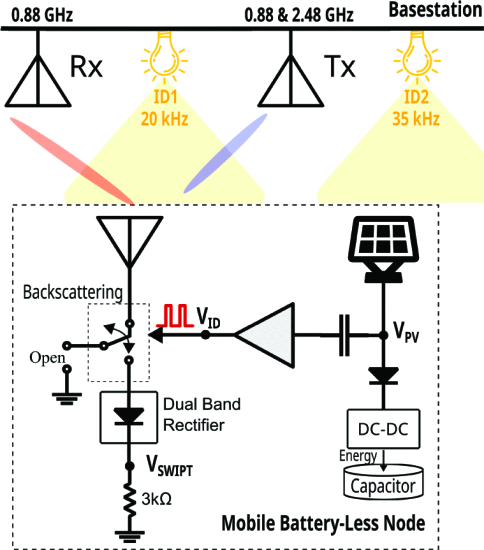 In the demonstration, the base station operates at 0.88 GHz and 2.48 GHz while LED transmitters provide optical signals at different modulation frequencies. The mobile node harvests energy through a dual-band RF rectifier and a photovoltaic interface, stores it in a capacitor and performs low-power communication via backscatter and light/RF downlink reception. This showcases a practical architecture for energy-autonomous sensing, communication, and localisation in future sustainable IoT deployments